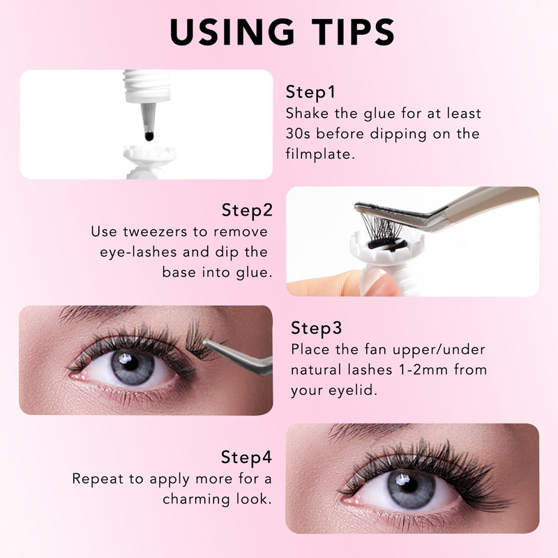 Il-proċess tal-applikazzjoni huwa rapidu u faċli. Ibda billi tagħżel il-clusters tal-lash mixtieqa tiegħek u tpoġġihom fuq wiċċ ċatt. Imbagħad, applika ammont żgħir tal-kolla tal-cluster tal-lash DIY tagħna fuq il-bażi ta 'kull cluster. Ħalli l-kolla tal-cluster tal-lash DIY tinxef għal ftit sekondi u mbagħad agħfas bil-mod il-clusters fuq il-lashes naturali tiegħek.
